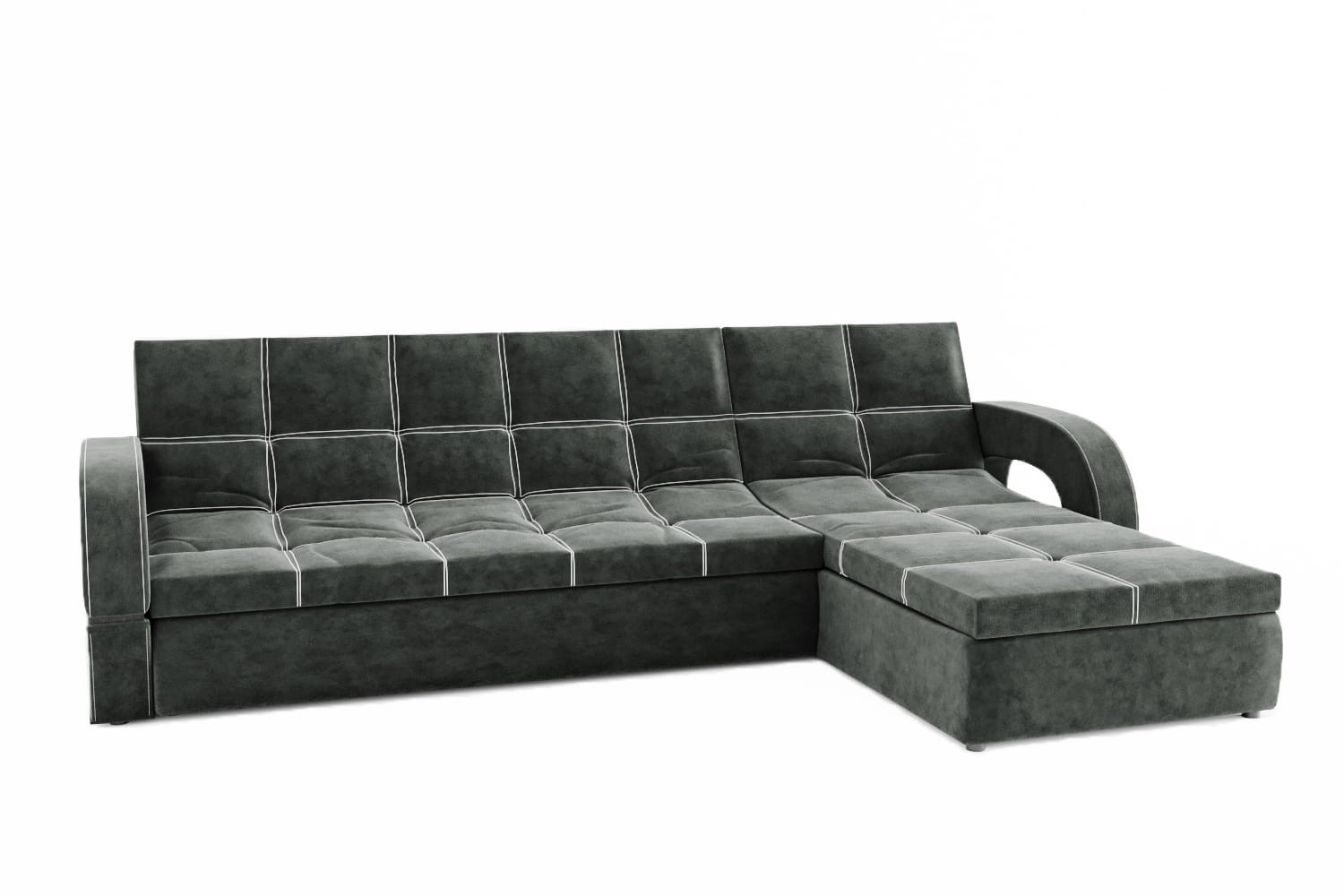 Особенности дивана: Каркас: ЛДСП, фанера, брус. Эргономичная мебель, позволяющая создать стильный интерьер. Обит качественным и плотным текстилем. Опорные элементы каркаса помогают равномерно распределять вес, благодаря чему напольное покрытие не продавливается. Механизм трансформации позволяет быстро и без особых напряжений превратить диван в удобное спальное место. Глубина дивана без учёта оттоманки: 1050 мм.
